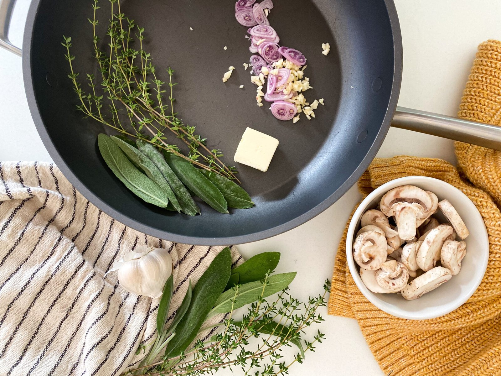 - In a largest skillet pan, over medium heat, add the butter, fresh herbs, shallot. garlic and salt. Let the butter melt and the pan heat up.