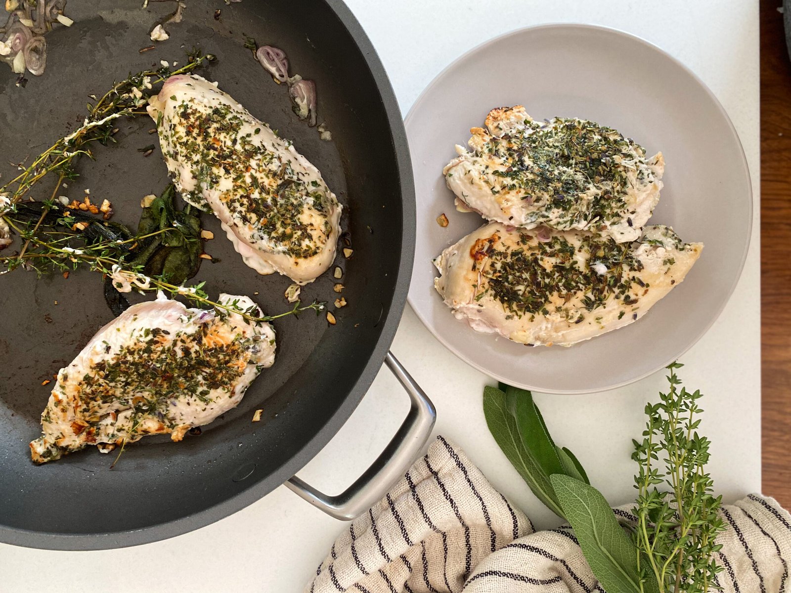 This recipes uses Herbs de Provence which is a dry herb mixture you can find at any grocery store, I love it. It’s so easy to use and I add it to chicken, fish, and fries. It’s a dry herb mix that combines thyme, basil, rosemary, oregano, bay leaf, tarragon and marjoram. It’s amazing and you want to have it on hand in your spice cabinet at all times. In this recipe we will add it to our skillet chicken.