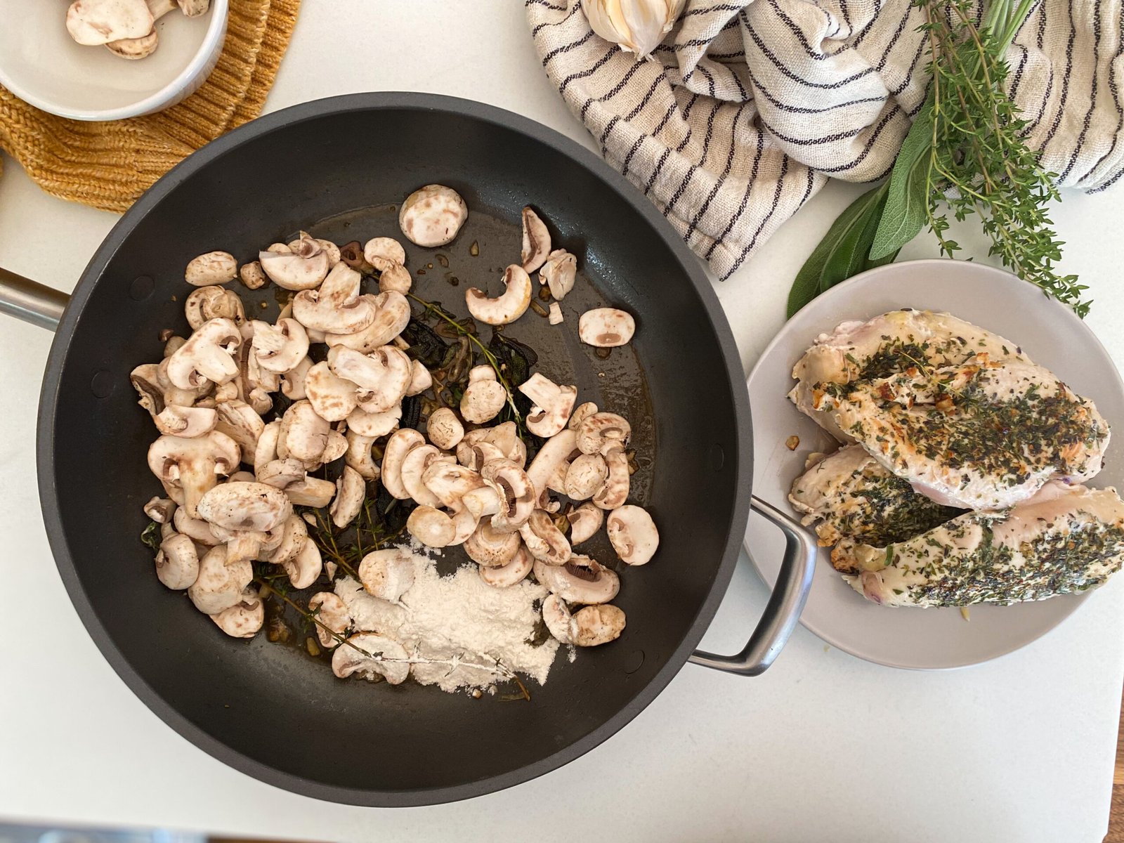 - Add in the mushrooms. Cook and let them brown just slightly, about 2-3 minutes. Add in the flour and stir to coat the mushrooms, cook for another minute.