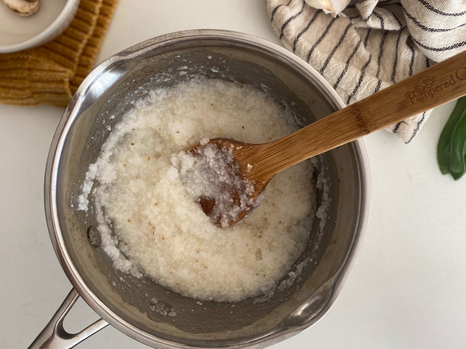 - While the chicken finishes cooking, make your polenta. Follow the instructions on the back of the package. Once hot and ready to serve, stir in the parmesan cheese.