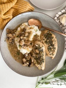 - Plate your chicken and polenta, spoon over the warm mushroom pan sauce and service.