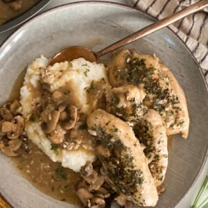 Skillet chicken with a mushroom pan sauce is a super simple cozy weeknight dinner, perfect for those chilly nights. Pan seared chicken perfectly browned and tender, complete with an herb-mushroom sauce. Served with creamy nutty parmesan polenta. It’s ultimate comfort.