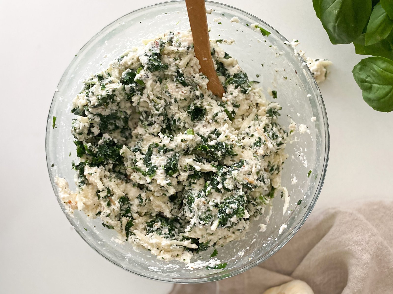 - In a large bowl, add your spinach, ricotta, nutmeg, Italian seasoning, egg, prepared garlic and shallot and mozzarella cheese in a bowl.