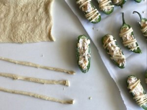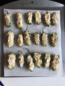 - Wrap it around the stuffed jalapeño peppers in a mummy like form, use your imagination and have fun.