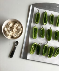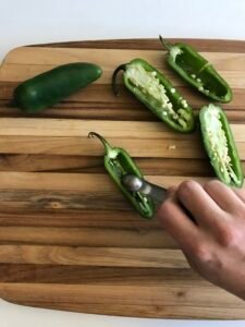- Slice the jalapeños in half length-wise, and scoop out the seeds. Be careful the seeds will leave a lasting impression on anything you touch afterwards. I usually use a 1/4 teaspoon to help because it’s small enough to fit into the pepper without breaking it. I insert it at the top, spoon down and scrape along the bottom of the pepper.