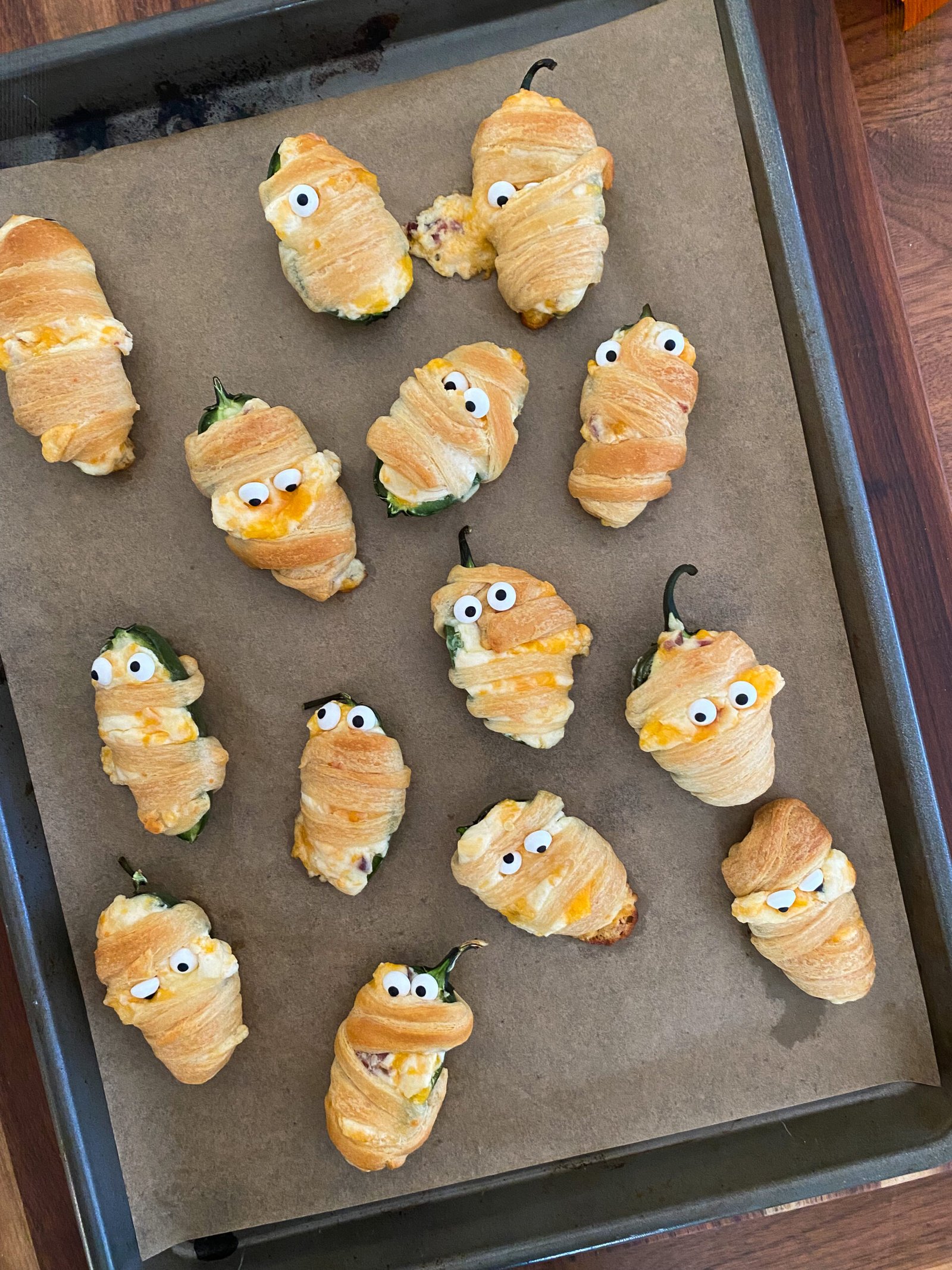 Jalapeño popper mummies are the ideal Halloween treat. Spicy, cheesy and all wrapped up snug in warm croissant mummy wrap.