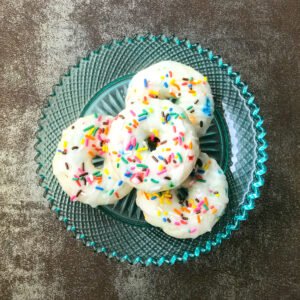 - Using a spoon, drizzle the glaze over the donuts and top with sprinkles.