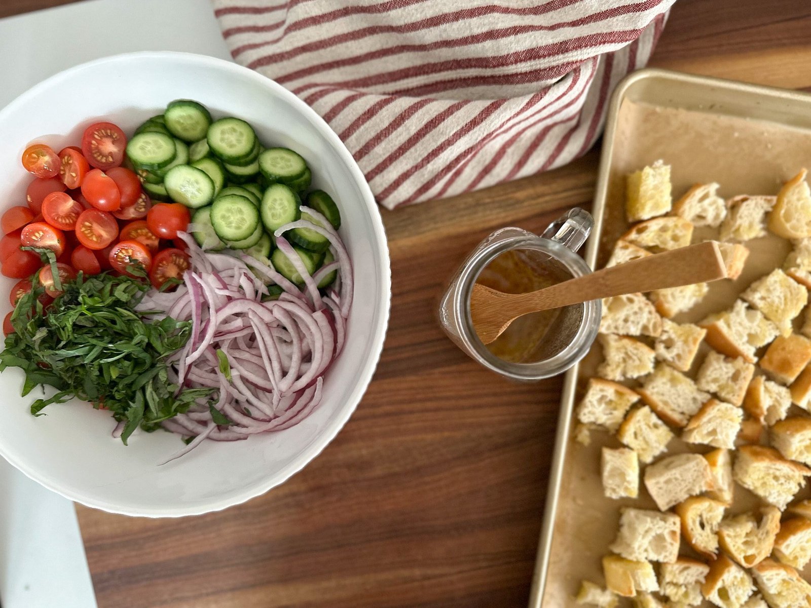 The salad: cherry tomatoes, purple onion, cucumbers and the olive oil and red wine vinegar can all be prepped 48 hours ahead of time. I even think the extra time created stronger flavors. Store in a food safe container, with a lid in the refrigerator until you’re ready to make the complete the panzanella salad with the homemade croutons and reverse-seared steak.
