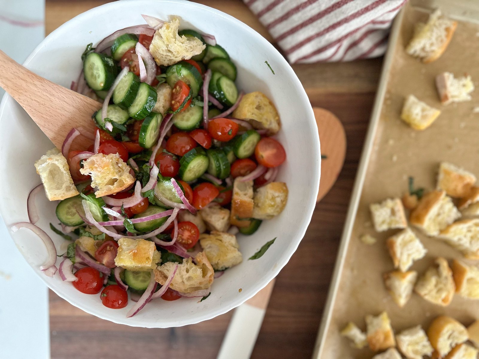 Panzanella salad originated from Italy – more specifically Tuscany. It was originally a salad that used stale bread, tomatoes and onions. Somewhere along the way cucumbers, with an olive oil and vinegar dressing, was tossed in. Today, you can find many more different varieties.