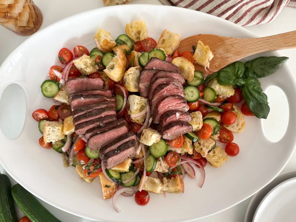 This recipe is easy to prep ahead. The panzanella salad can be prepped days in advance, wait until you’re ready to serve before you add the bread croutons and warm flat iron steak.