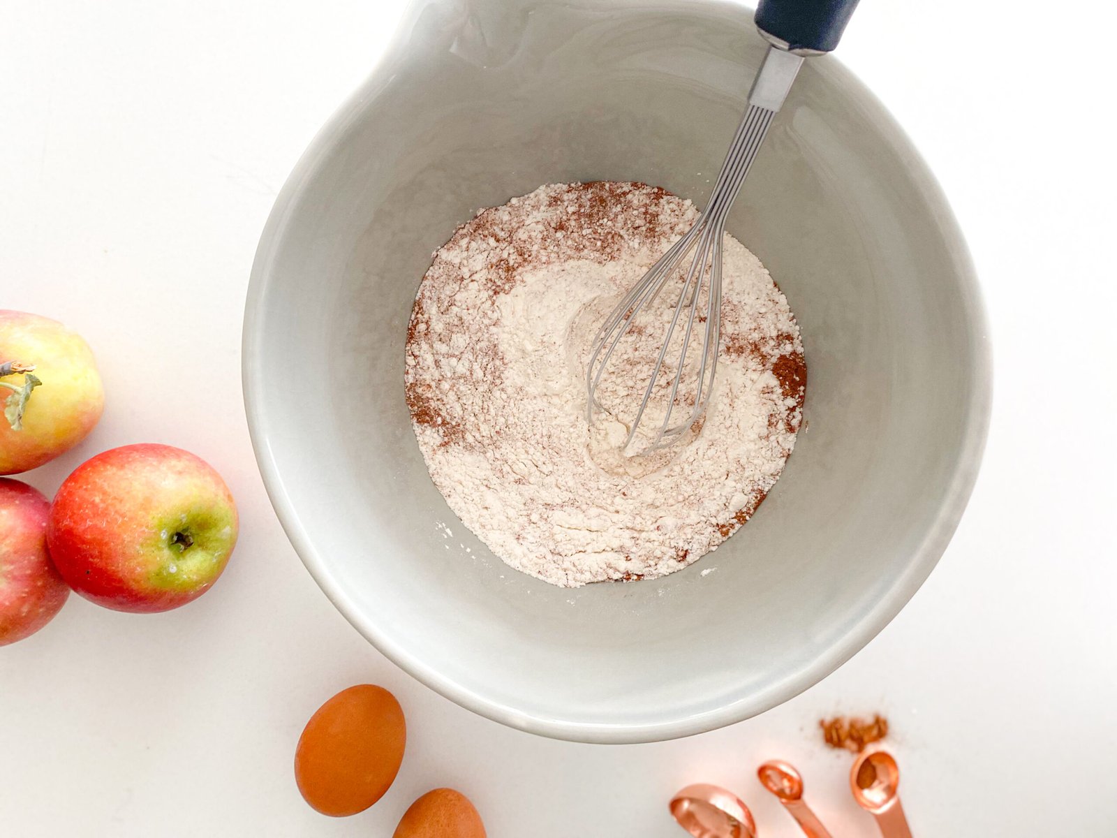 - In a bowl, whisk together your flour, baking powder, baking soda, apple pie spice and salt. Set aside.