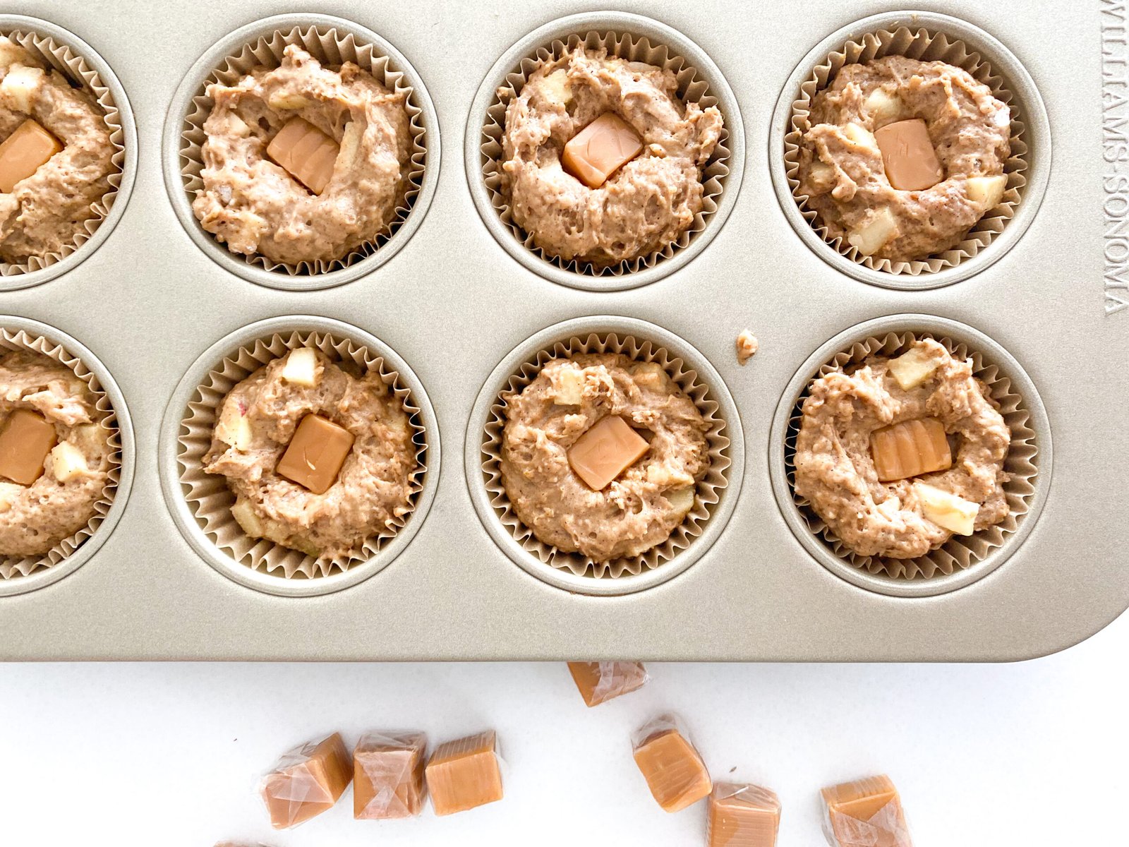 These caramel apple muffins are stuffed with soft caramel candies which are easy to find in your local grocery store. I used these, you only need one 11oz bag for the recipe but can you ever have too many caramels? Once the batter is in the muffin cups, it’s as easy as pushing a cube of caramel in the middle.