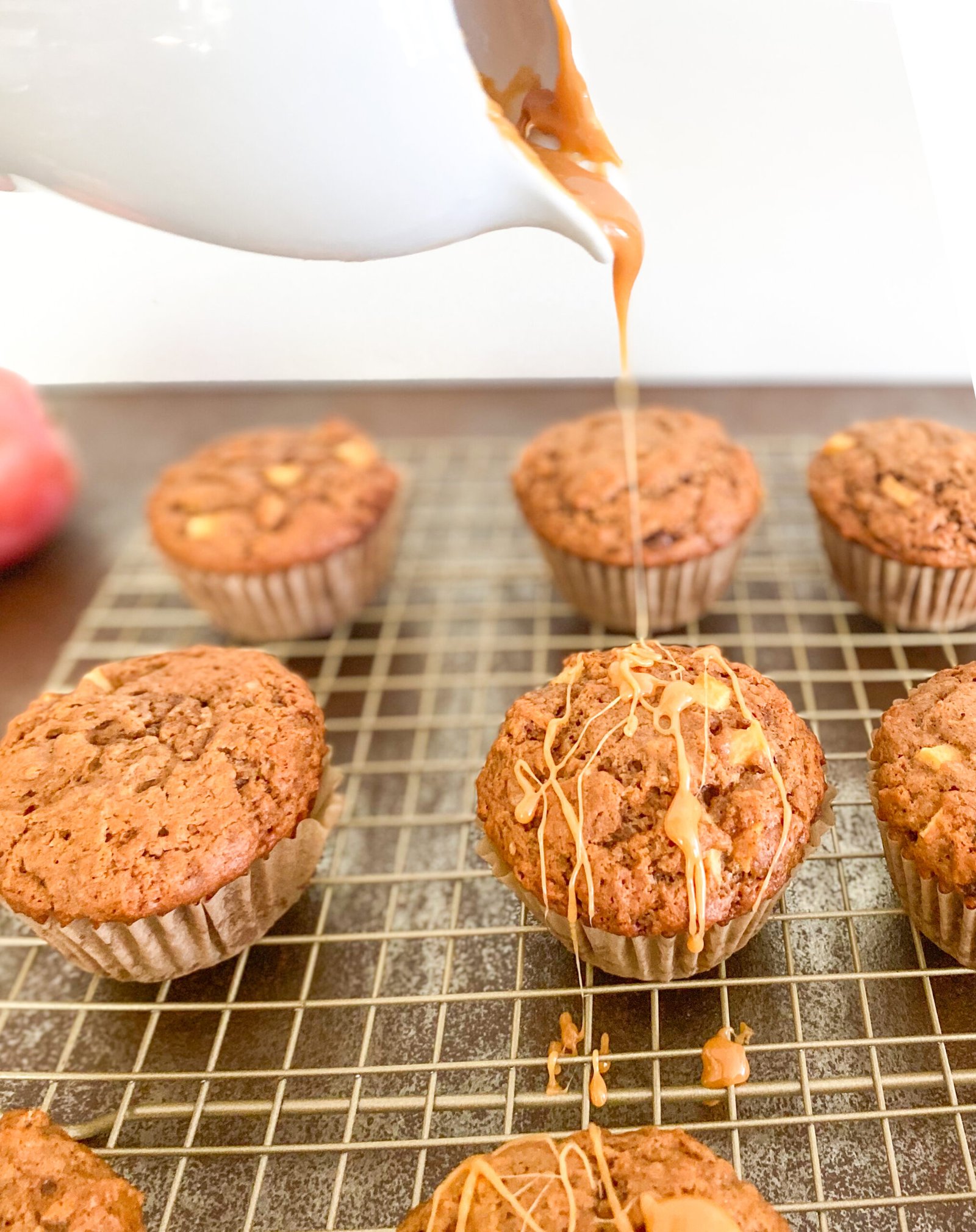 - While your muffins cool, you can make the caramel drizzle. In a sauce pan over low heat, add in 7 unwrapped caramel candies and let them slowly melt. Add in 1 TSBP of milk. Continue to stir until melted. Remove from the heat and drizzle over your muffins immediately. If the caramel drizzle hardens up before you finish drizzling, re-heat until back to the correct drizzle consistency.