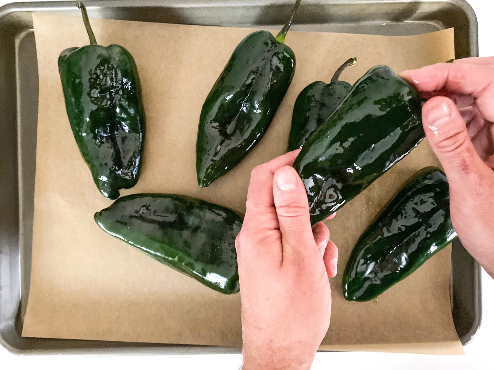 - While the chicken in cooking, you will want to prepare your poblano peppers, rinse and lightly coat your peppers in olive oil, making sure the entire surface area is covered.