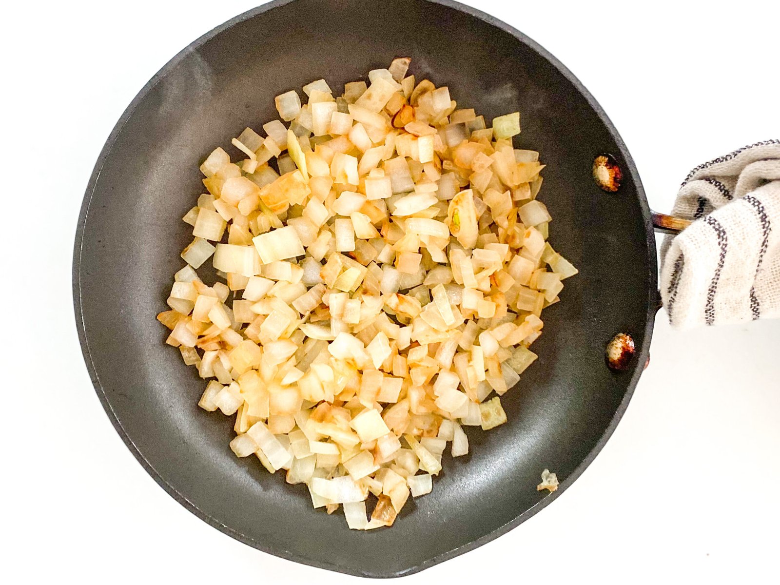 - You can do this while your peppers cool to save prep time, sauté your onion. In a pan, over medium heat, add a 1 TBSP of olive oil and a pinch of salt. Cook until they are translucent and soft about 5 minutes.