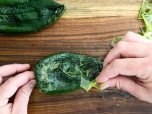 It take about 20 minutes to get the blister when you use your broiler, once they are cool enough to handle, you will pull away the outer later to show off the deep green color and expose the unique deliciousness of the poblano pepper.