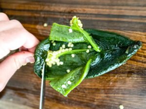- Once the skin is peeled off, you will want to remove the seeds. The more seeds you leave behind, the spicer it will be. Poblano peppers have a different spice than jalapeños so I suggest removing as much as you can. Carefully cut down the center of the pepper, cut below the the seed rib and pull out, you should be able to pull the seed out attached to the rib. You can also use a tsp spoon to scrape them out.