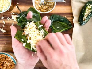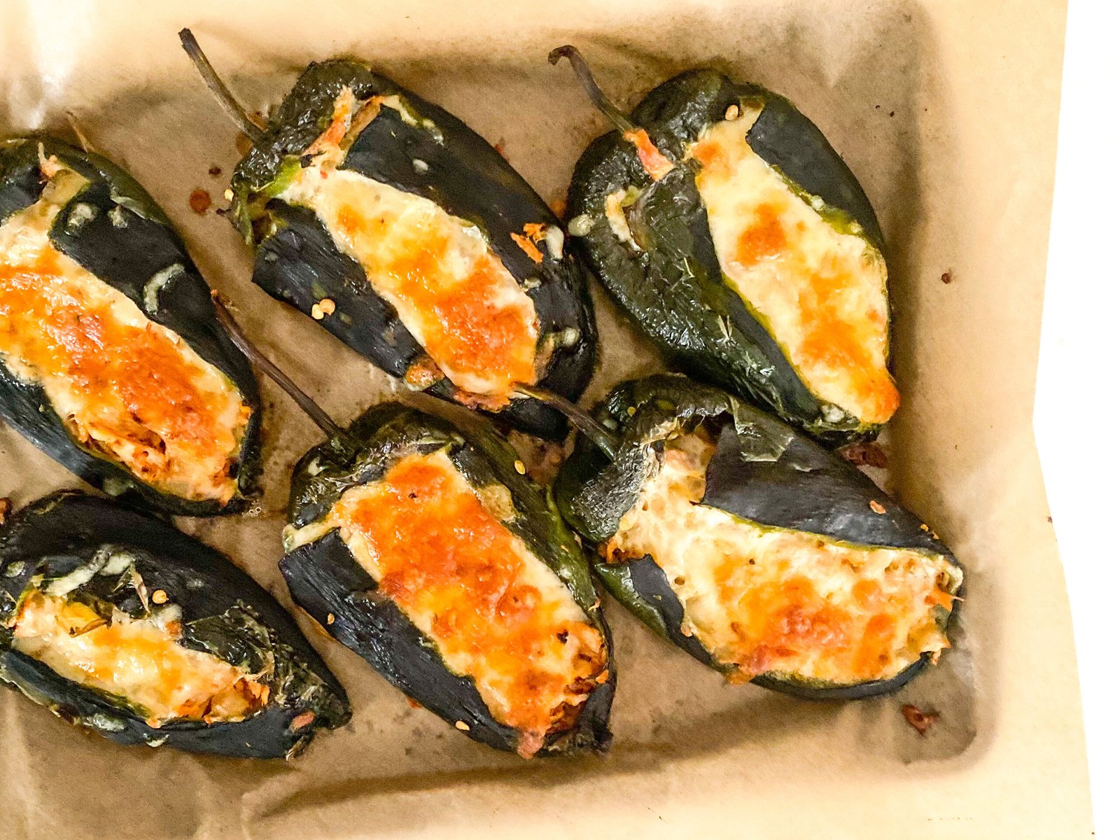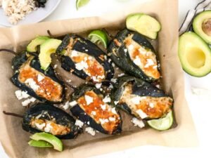 Brad’s spicy stuffed poblano peppers is one of his specialties and always on rotation in our house. Stuffed poblano peppers with salsa-cooked shredded chicken, onions and cheese, I mean how can you go wrong? He has been making this dish for so many years now, and I’m so excited to share it with you.