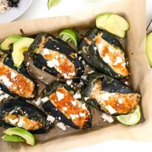 We always include a side of rice and beans with this meal to complete the dish. We used include the rice inside of then poblano peppers, which is a great “all-packaged” deal but we found that we like more chicken and cheese to our pepper.