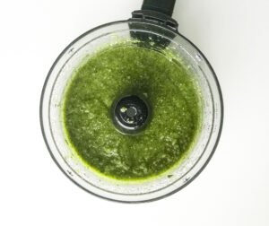 - Pulse the food processor, as you pulse, pour in the olive oil. Continue to process until all ingredients are incorporated. Taste test! Add in more garlic if you would like. It it's too strong or bitter (from the olive oil) add in a pinch or two of salt and pulse a few times to make sure it's mixed in. Salt will soften the intensity of the flavors.