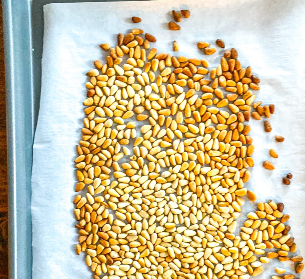 You can toast and save. So if you know you’re going to be making basil pesto throughout the summer or for as long as your basil plant lives, you can toast a bunch of pine nuts and then save them. Once the oils are released from the heat of the oven, it is important to store them in a cold dark place to help slow down the aging process (this lesson comes to you from Culinary School). As soon as the pine nuts cool, them in a container with lid or a ziplock bag and store in your freezer for the longest lasting option. You can take from the freezer and use right away, no need to defrost or thaw.