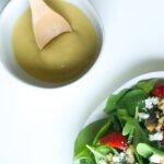 This dressing will be strong in flavor but that is necessary for the raw spinach and arugula. A heavy-handed drizzle is all you really need. If you want to calm down some of the intensity of flavors, another pinch of salt should help!