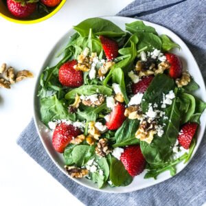 For this salad, spinach and strawberries are on the dirty dozen list so make sure your wash them both before making this salad! Spinach can be washed like lettuce, the easiest way is to spin the leaves dry in a salad spinner. If you don’t have one of those, wash under cold water and pat dry with a towel.