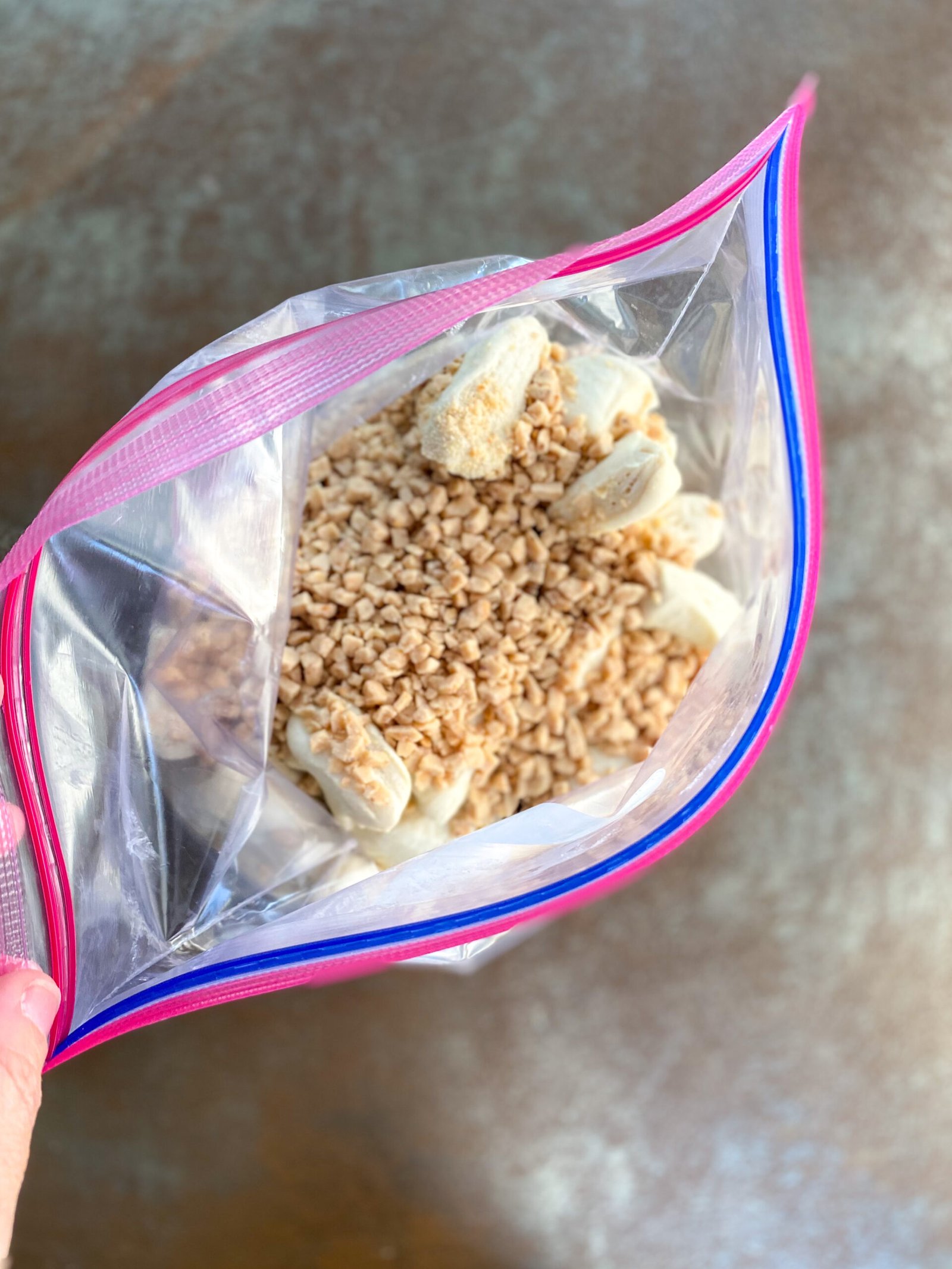 - In a large ziplock bag, shake the biscuits and the toffee bits together to coat the biscuit pieces.