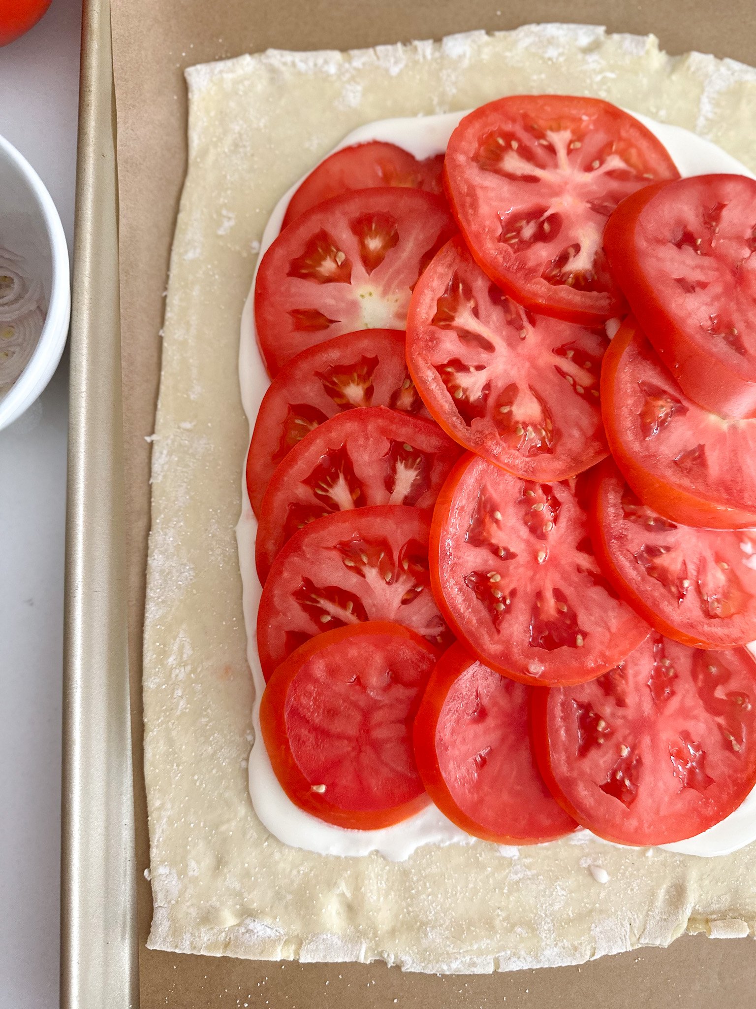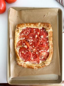 - Quick drizzle over olive oil. Bake at 400F for 20 minutes, puff pastry should be browned and tomatoes baked to perfection. Add red pepper flakes.