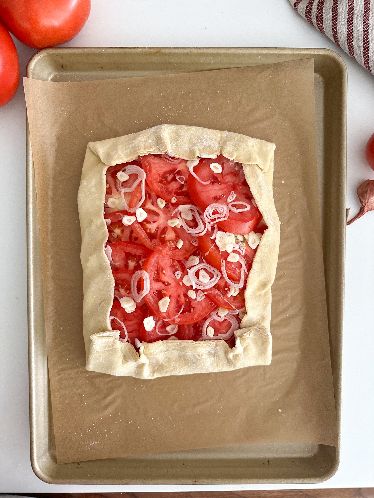 This summer tomato galette with a whipped honey feta is a really easy and delicious way to to use up those tomatoes. A buttery puff pastry with a creamy sweet honey feta spread, topped with beautiful ripe tomatoes, garlic and shallots. Simple ingredients with the best pop of flavors. Baked in 20 minutes!