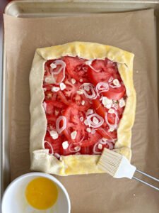 - Separate the egg yolk, whisk the yolk and brush over the puff pastry edges. Optional: add a sprinkle of salt and fresh thyme on the crust edges.