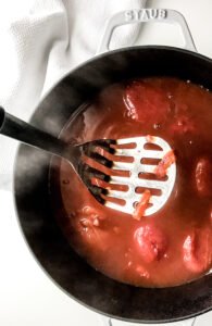 - Use a hand potato masher, but you can also use a wooden spoon to press down pressure on the tomatoes. You want to get every tomato broken open.