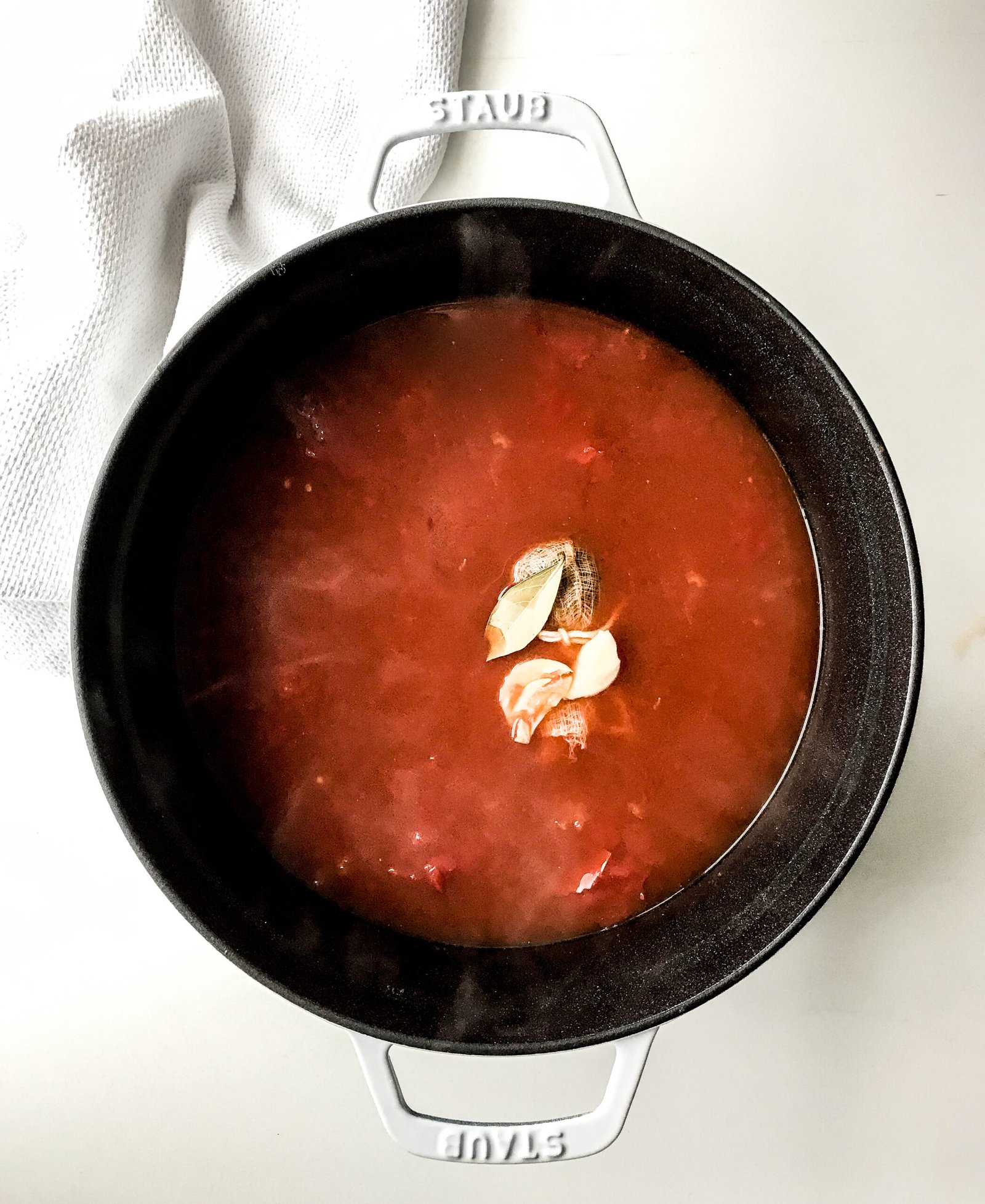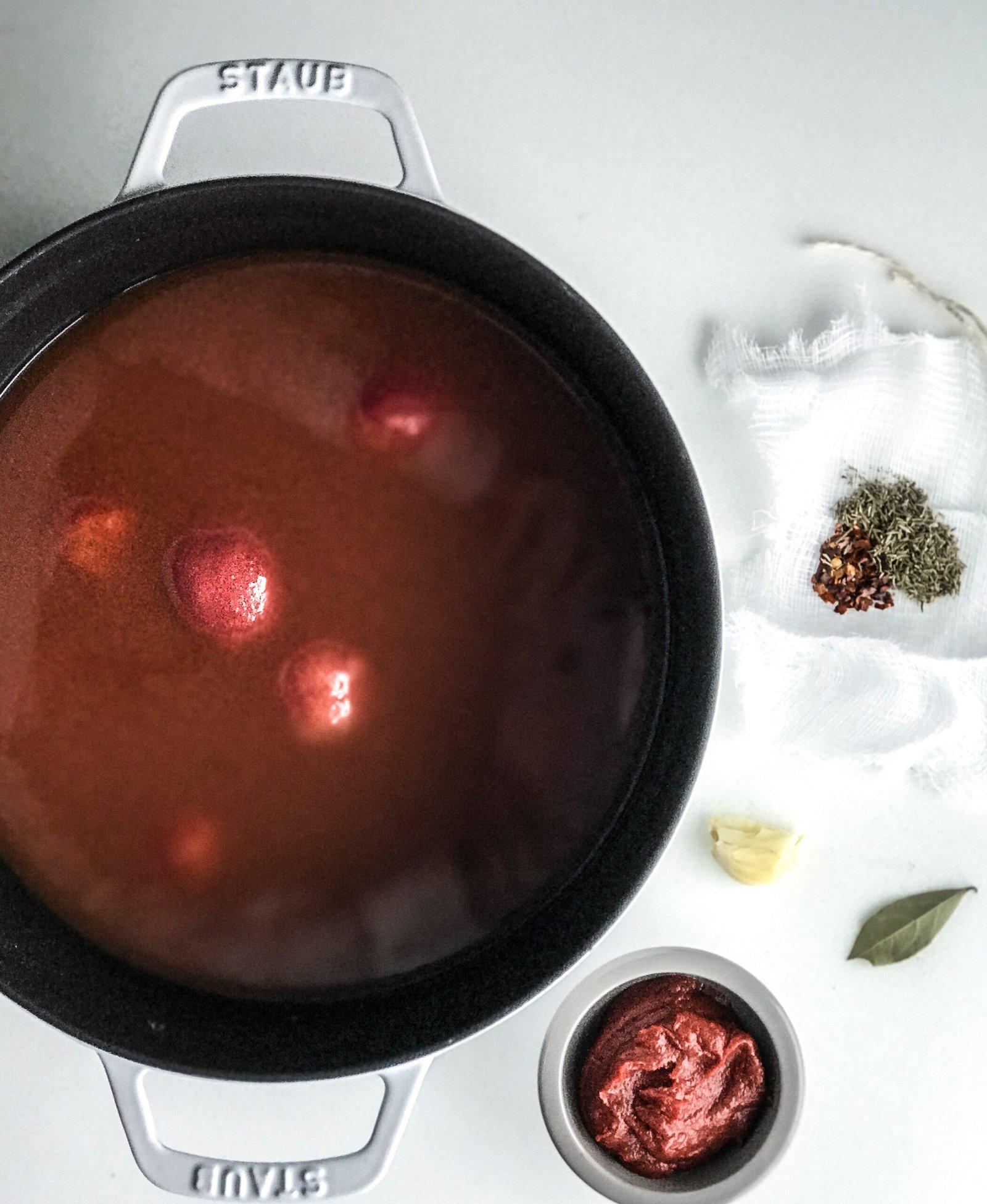- Because the soup will get strained at the end, the bay leaf and smashed clove of garlic can go directly into the pot, however the dry thyme and red pepper flakes are still really tiny and should go into a sachet made from cheesecloth so that the flavor can infuse into the soup without speckling the smooth tomato red soup appearance.
