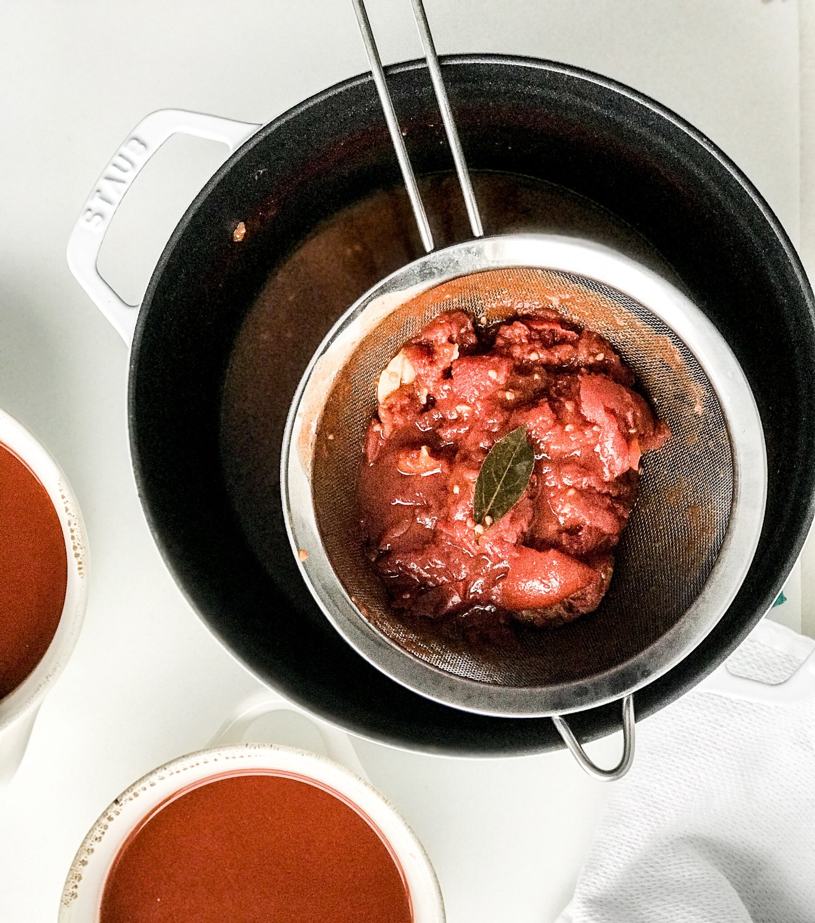 - Once it's done cooking you will need to strain out the tomato chunks, seeds, bay leaf and garlic. Your goal is to have silky smooth red soup. This will take a few minutes. Pro-tip, if you tap the strainer, liquid will pass through a little faster so I usually tap mine against the bowl I'm straining the soup into.