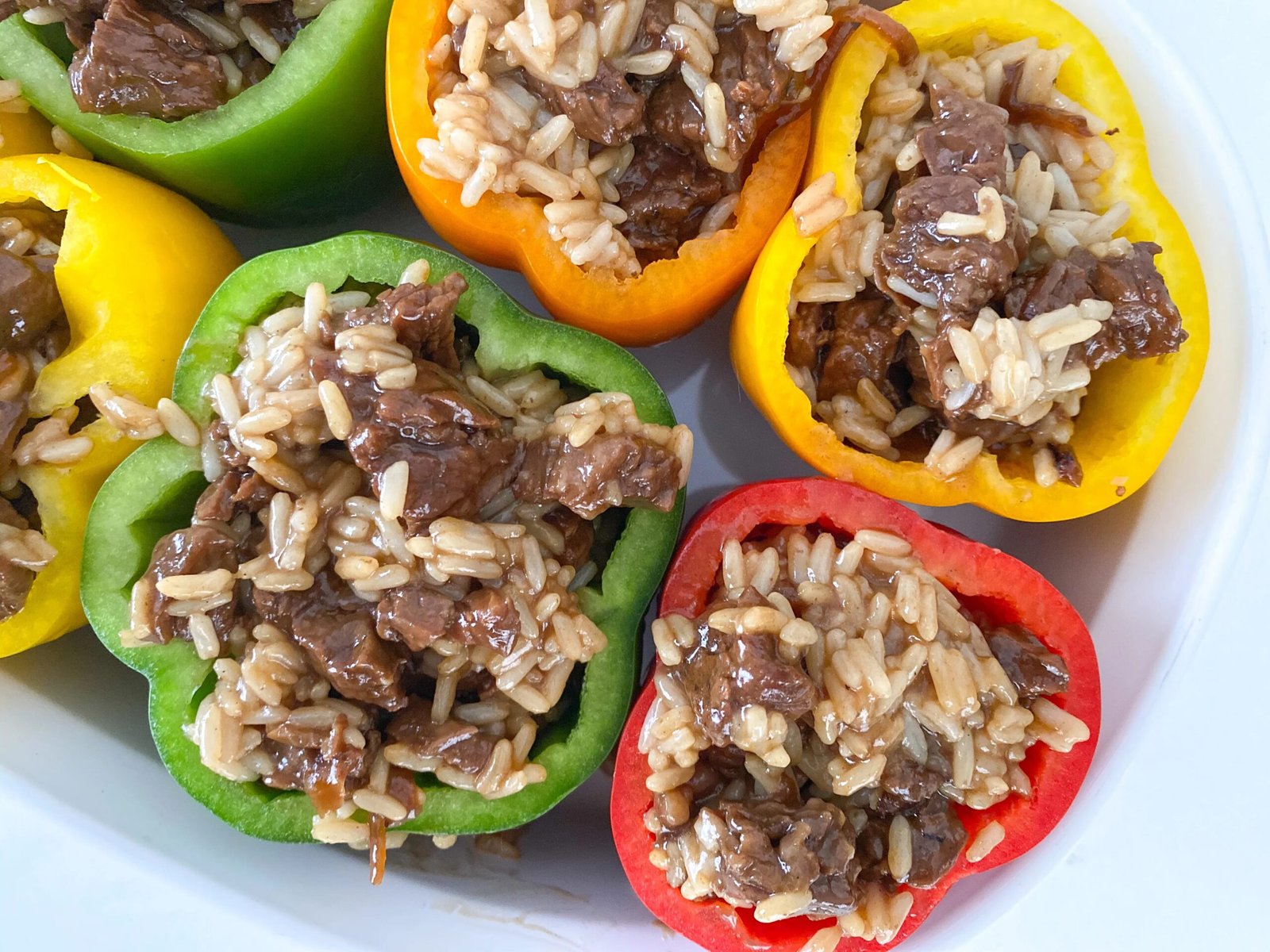 Savory and spicy flavors of caramelized onion, brown sugar, soy sauce. Stuffed pepper steak cooked with rice in a colorful bell pepper.See make ahead and crock-pot options in the blog.