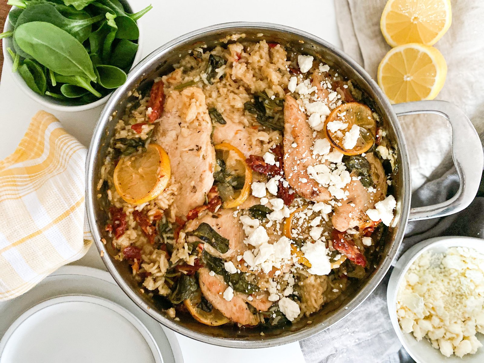 This Mediterranean inspired baked chicken, is bright and vibrant with fresh lemon, baby spinach, sun dried tomatoes, and chicken baked to perfection over a bed of rice and you use only one pan!