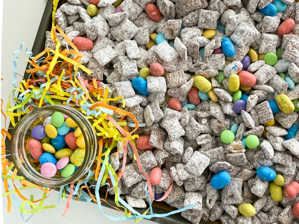 Springtime muddy buddies are so quick to throw together for a simple and easy sweet treat. I mean how cute are these?!? They’re perfect to have around the house for any springtime occasion, birthday parties, egg hunts, bridal/baby showers, Mother’s day – you name it.