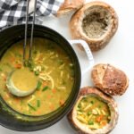 Over medium heat, melt butter. Add in onions and all the seasonings (Garlic, Thyme, Bay Leaf, Turmeric, 1/2 tsp of Salt), stir to combine. Cook until they are soft and translucent about 5 minutes.Note: If you don’t want your soup to have a yellowish tint, you can omit the turmeric.