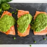 Place your pan over medium heat and drizzle in some olive oil. After the pan and olive oil warm up, place your salmon fillets, top-side down, skin side up. Sear the fillets until they form a red-ish crust, flip over and finish cooking skin side down until the internal temperature is 145F (see blog notes for additional helpful hints).Rest for a few minutes, top with pea basil pesto.