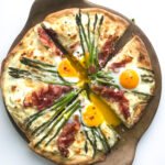 Add on the asparagus and prosciutto.Bake for 10 minutes at 450F.