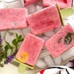 If you are adding in strawberry slices, banana slices or herbs: pour the strawberry creme base to fill up 2/3 of the popsicle mold, drop in a couple of your add-ins, if needed, top off your mold with more base and add your popsicle stick, it may need to be guided in around your add-ins.