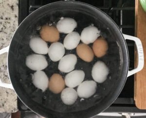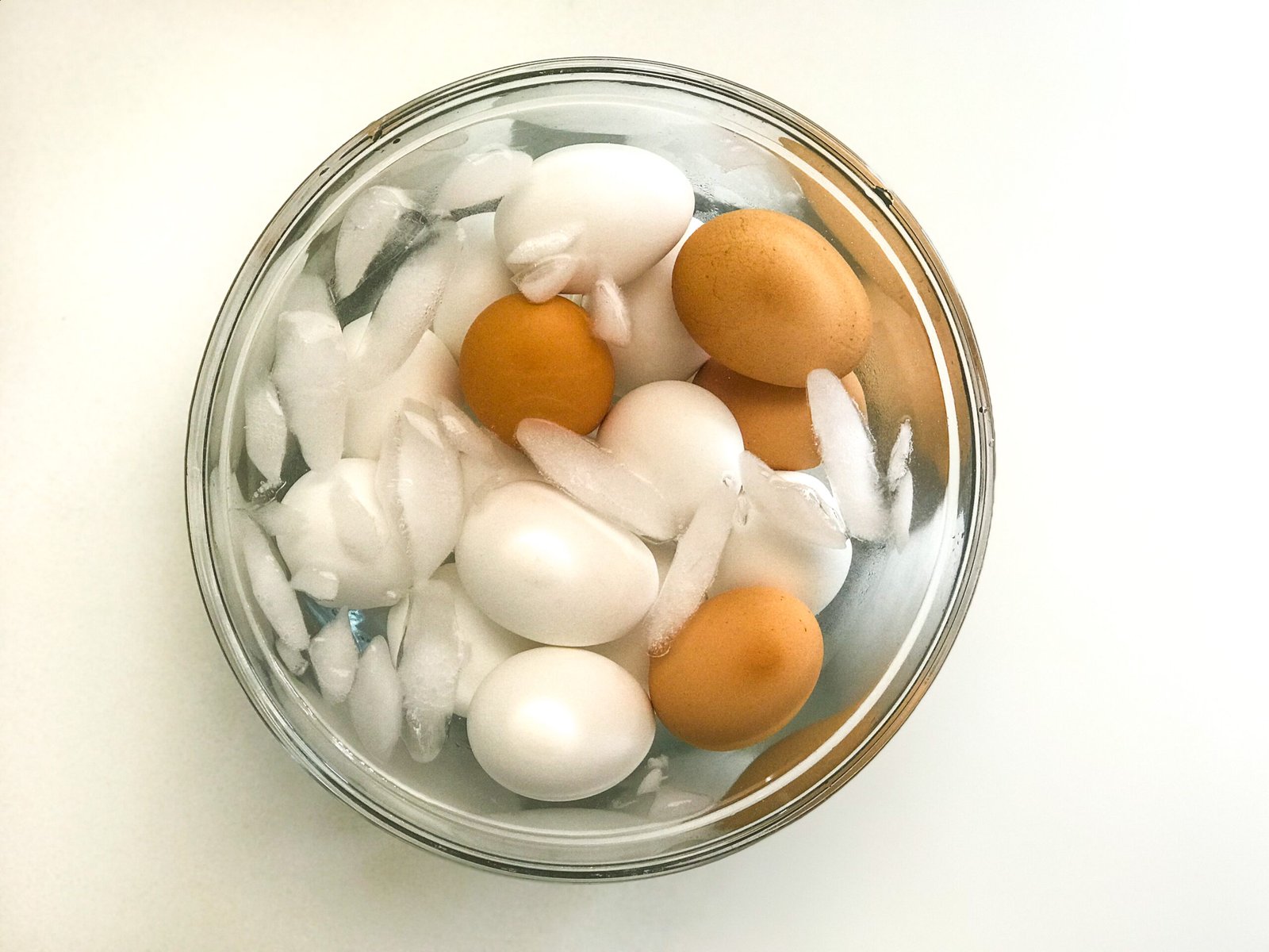 As the eggs cook, prepare an ice bath, in a large bowl add a ton of ice and cold water.